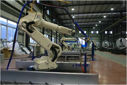 雙工位切割機(jī)器人工作站主要用于電力機(jī)車和煤機(jī)產(chǎn)品碳素鋼、低合金高強(qiáng)度鋼板材坡口的切割加工。為有效提高生產(chǎn)效率,減小工人勞動(dòng)強(qiáng)度,工作站采用單機(jī)器人雙工位平行布置方式,即:?jiǎn)翁鬃角懈顧C(jī)器人+雙套切割平臺(tái)。機(jī)器人選用日本OTC公司生產(chǎn)的AII-V6L型機(jī)器人,工作半徑達(dá)2006mm。該機(jī)器人具有臂伸范圍廣,負(fù)載大等特點(diǎn),特別適合于切割加工的應(yīng)用。